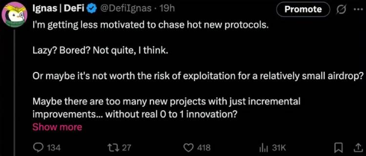 答:现在寻找新项目更困难的原因有几个:首先,资金流动性比牛市时紧张,山寨季尚未到来;其次,大多数项目的空投回报已显著缩水;第三,资金被稀释到大量协议中,缺乏现象级爆点项目;最后,许多新项目仅停留在渐进式优化层面,缺少从0到1的突破性创新。