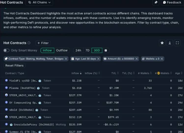 答:Nansen有两个特别有用的功能:一是积分激励体系,用户可以通过订阅付费套餐、参与质押挖矿或邀请好友注册来累积积分;二是热门合约资金流向追踪功能,用户可以通过筛选条件(如剔除DEX与流动性池、设置最低TVL、限定合约创建时间)发现新兴的热门协议。