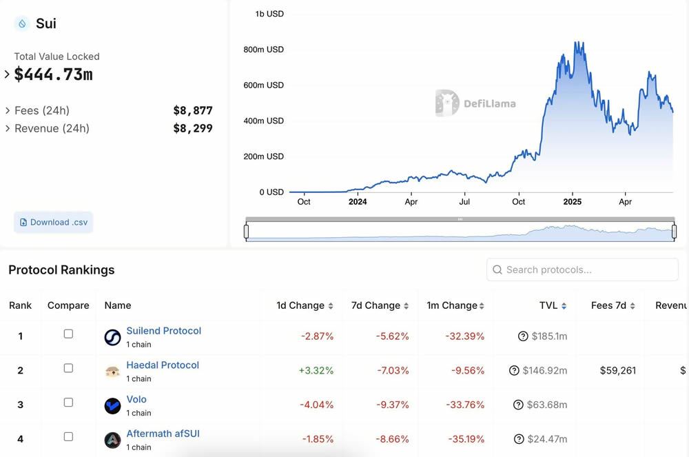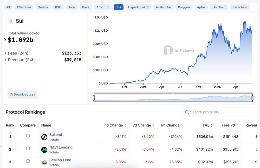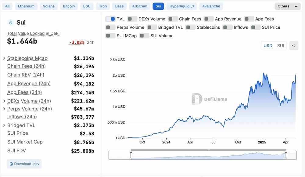 Sui的架构非常适合高速借贷、交易和质押平台。它在DeFi领域增长显著,总锁定价值(TVL)从上线时的约2500万美元猛增到2025年5月的20多亿美元,成为TVL排名第三的非EVM公链。
