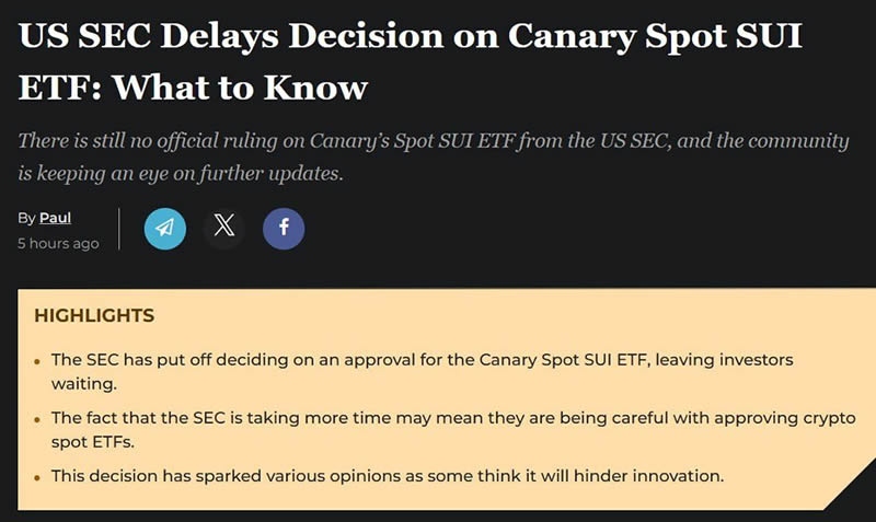 此外,监管的不确定性也带来了另一个重大挑战。全球区块链格局受不断变化的法律和政策的影响,例如美国证券交易委员会(SEC)推迟SUI ETF的审批(例如,推迟到2025年7月)。