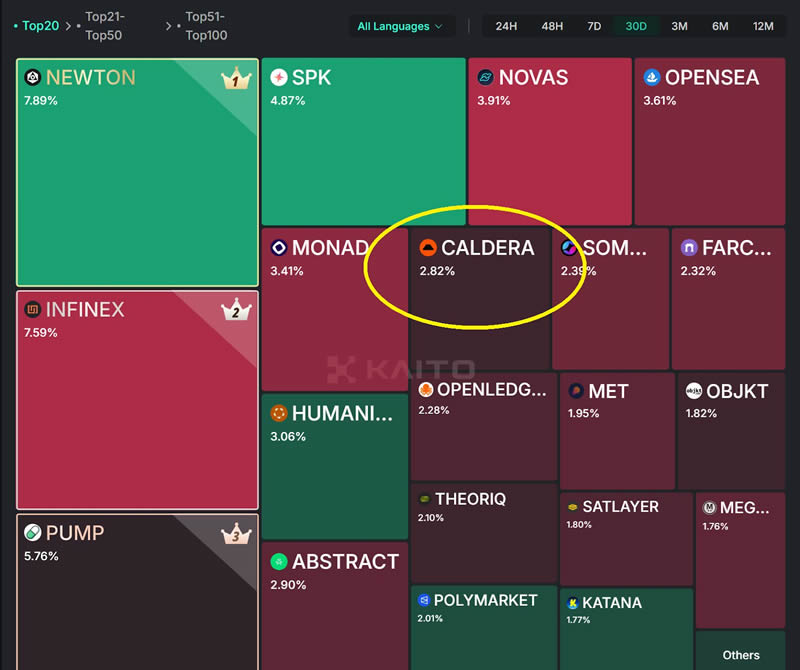 值得一提的是,在Kaito Pre-tge前30天的mindshare排名中,Caldera刚好排在第十名,成功挤进了前十。