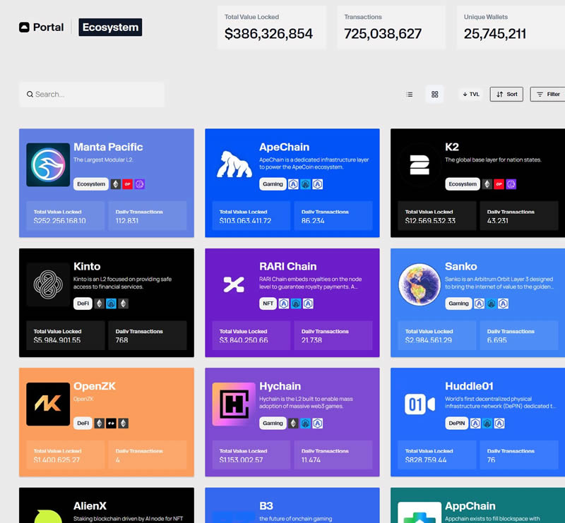 根据官网数据,目前已经部署了超过50条链,类型涵盖了游戏、DeFi、NFT、DePIN、社交、AI、通用链和测试网等多个领域。