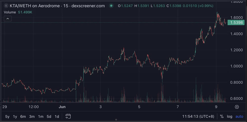Keeta的市场宣传十分吸引人:1000万TPS、亚秒级的交易确认时间,还有前谷歌CEO埃里克·施密特担任顾问。自从5月初在Base上推出以来,KTA代币的价格从0.22美元一路飙升至1.18美元,涨幅高达435%,流通市值一度突破6亿美元大关。