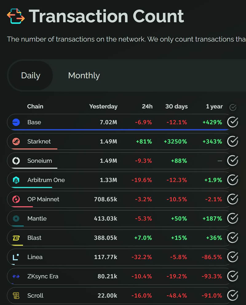 根据Transaction Count - growthepie的数据,在几个知名Layer 2中,Soneium的每日交易量已经排进前三。