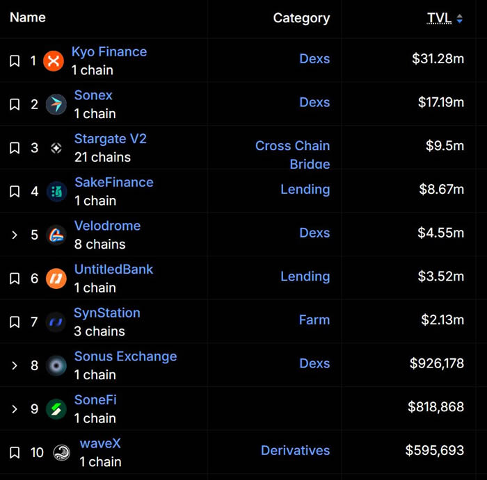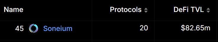 根据DefilLama的数据,Soneium的TVL为8200万美金,在所有链中排名第45位。