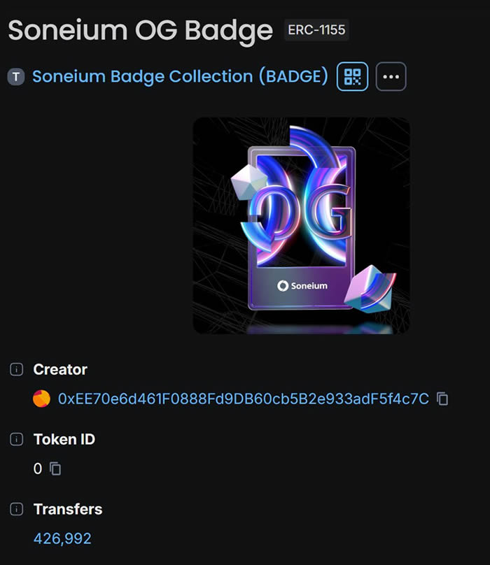 这个活动的灵感来源于Soneium之前推出的OG Badge活动。OG Badge是由Soneium官方推出的,目的是标识出Soneium早期参与者的徽章计划,针对那些在Soneium链上有足够交易量的地址,空投灵魂绑定徽章。当时这个活动成功吸引了大量用户参与交互,最终共发放了超过42万个Soneium OG Badge。