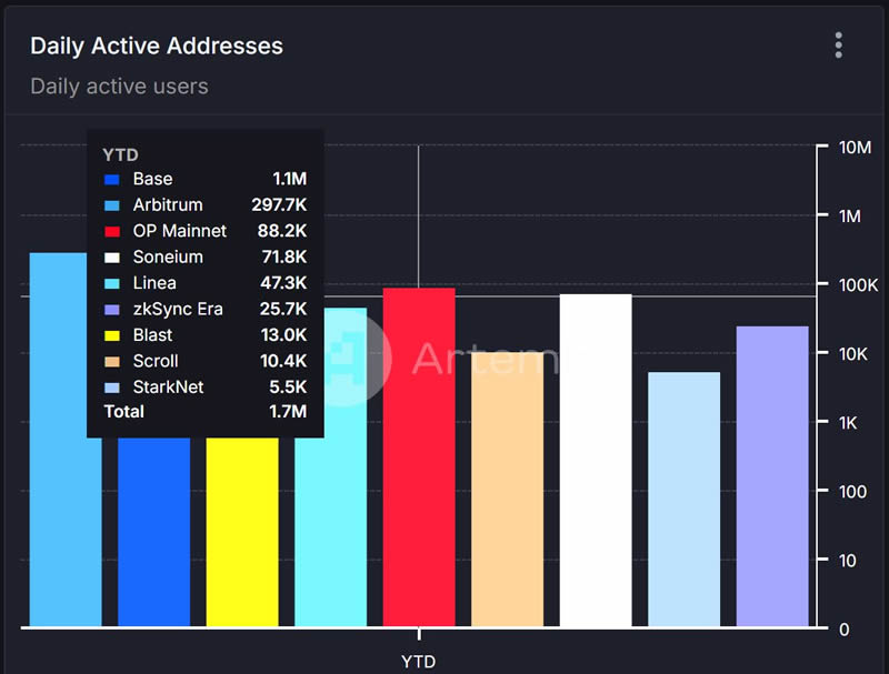 在Artemis平台上与其他几条知名Layer 2比较,Soneium目前每日活跃地址数已经超过了许多Layer 2,排在第四名,距离第三名的OP已经不远。