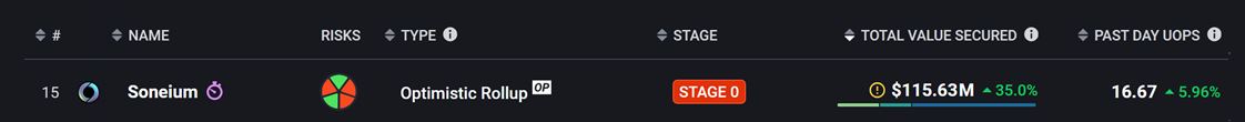 作为一条Layer 2链,根据Layer 2资讯平台L2BEAT的数据,Soneium目前总TVS约1亿1500万美金,排名第15位。