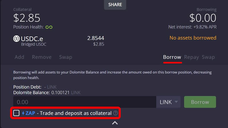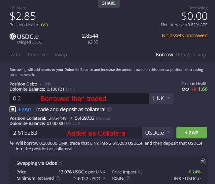 以上两张图展示了在一个以USDC.e作为抵押资产,LINK作为债务资产的仓位中,可以设置"继续借出LINK → 交易为USDC.e → 存入作为抵押品"的流程为ZAP一键完成。