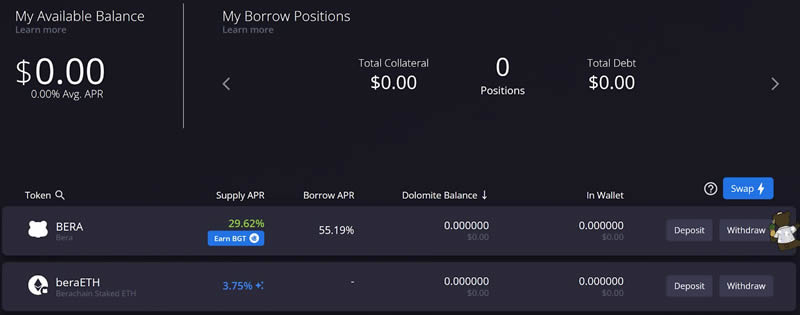 Dolomite支持POL资产抵押借贷,同时保留原链POL奖励,能够循环操作最大化收益。此外,它还允许使用治理代币BGT作为抵押资产,提高资本效率(如果发生清算会将BGT赎回成BERA来执行清算)。