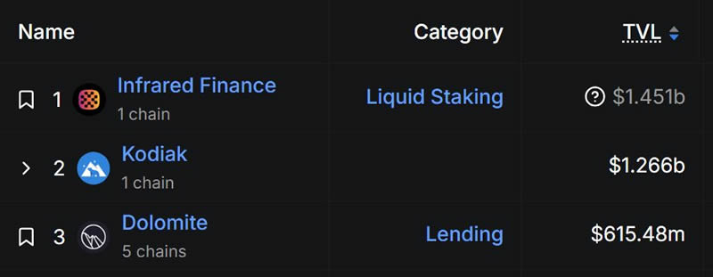 目前Dolomite的TVL达到六亿六千万美金,是DeFiLlama上第十大借贷协议;大部分TVL集中在Berachain,是该链的第三大协议(如果只看借贷类,则是第一大)。