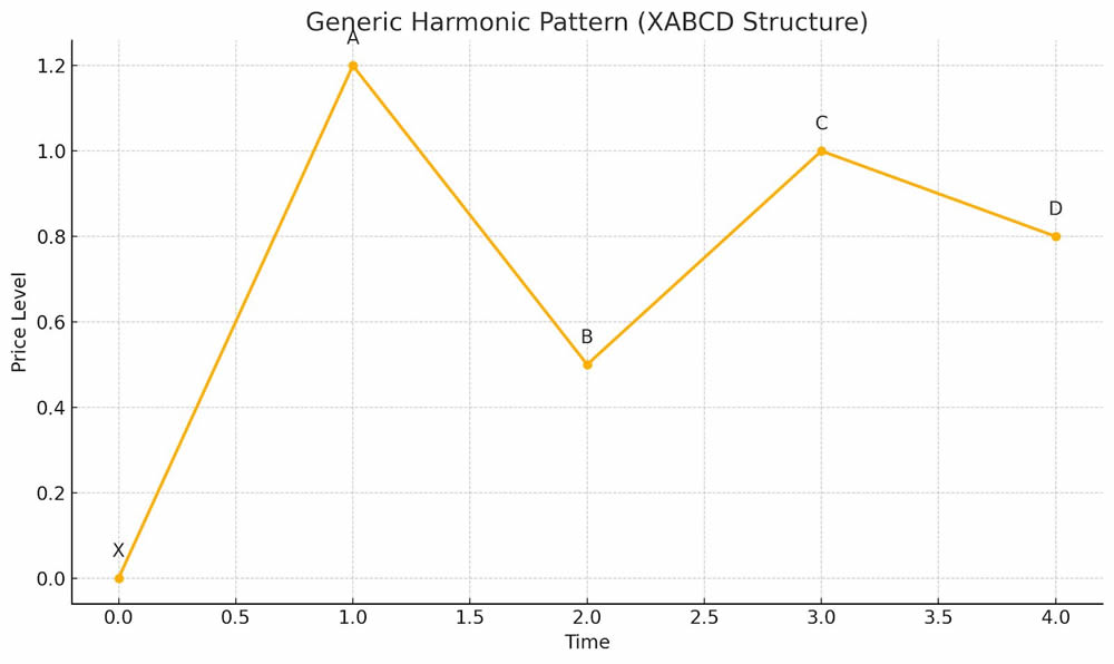 大多数谐波形态基于标记为XABCD的五点结构。这些点之间的每个段对应特定的 斐波那契回调 和延伸水平。这种结构使交易者能够绘制价格波动并以高度精确性预测未来走势。目标是在PRZ内完成D点,这通常作为交易入场的触发点。