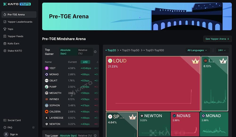 此外,Kaito还推出了Kaito Pro和Kaito Connect两大功能模块。Kaito Pro提供深度的市场情报,帮助项目方制定策略;Kaito Connect则通过"Yapper排行榜"和"Yapper Launchpad"功能,将用户的参与行为与市场动态结合,形成一个市场驱动的生态系统。这种双向服务的模式,让Kaito成为InfoFi赛道中的领跑者。