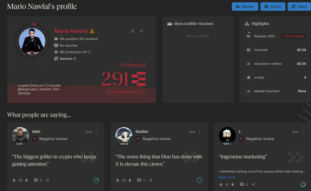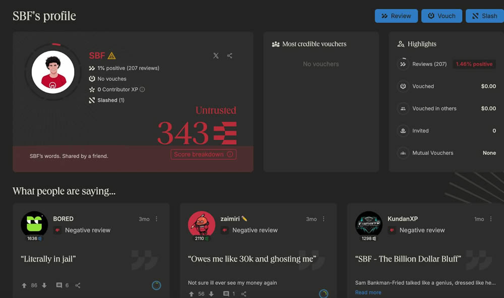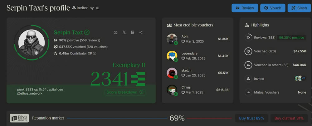 不过这也反映出一个现象:过去,像我们这样的普通加密货币爱好者,面对各种KOL与OG,其实没有太多抵抗力,即使被割被骗通常也只能自认倒霉。但在有了Ethos Network这样的信誉系统后,我们至少可以给个负评,帮其他负评点赞,如果自身信誉足够还能发起Slash提案,让事件浮出水面由社群投票决定。