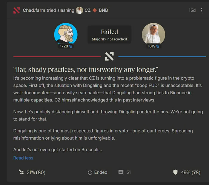 因为一些关于币安内幕交易的传言,以及针对CZ的发言,@chadstrdaumus0批评CZ是骗子,散播不实信息,并在Ethos Network上对CZ提案发起Slash。
