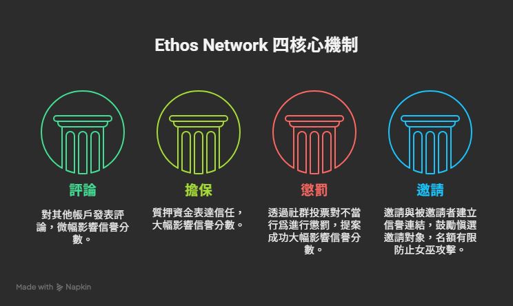 答:Ethos Network的四大核心机制包括:评论(Review)、担保(Vouch)、惩罚(Slash)和邀请(Invite)。这些机制共同作用,建立、衡量和维护链上信誉系统。