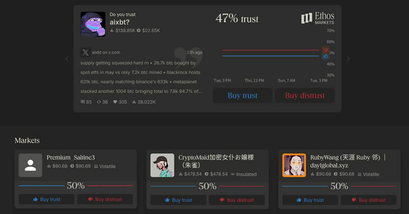 2、Ethos Market:链上信誉市场,可以简单理解为预测市场的信誉版。将信誉视为一种资产,可以买入、做空他人信誉分数。看好某人会持续获得好评,可以买入他的信誉,未来价格上涨可出售获利;反之看坏也能做空,默认从50%开始。