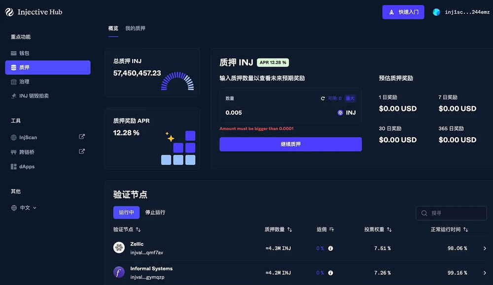 Injective 是基于Tendermint PoS 共识机制的网路,因此质押(Stake)功能对网路安全至关重要。用户在Hub上可以轻松参与质押。