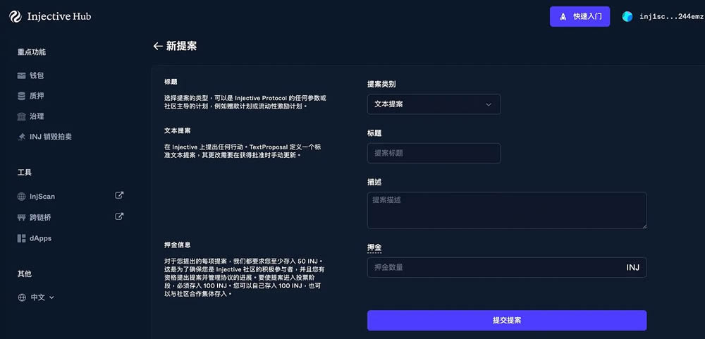 值得一提的是,Injective 的(文本)治理提案门槛不高,不需要你是巨鲸才能发声,持有少量$INJ 也有权利提出社群提案,小虾米也能发声。