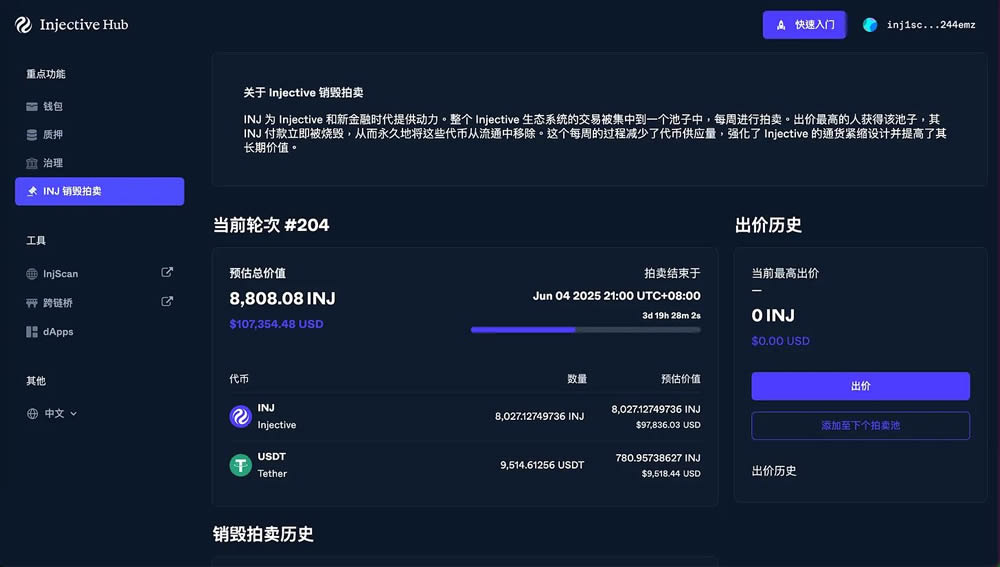 Injective 的交易手续费一部分用于购买$INJ 并定期销毁,用户可以在Hub的「销毁拍卖」(Burn Auction)页面看到每周的销毁数据。