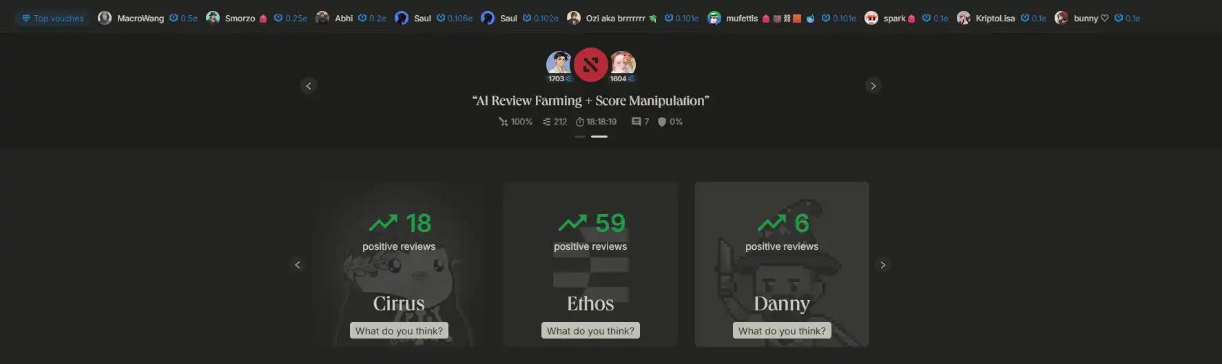Ethos 很像币圈版的"大众点评",用户可以在这个链上声誉网络对项目方或是币圈的个体玩家给出好评或差评。未来,这可能会成为项目方筛选合作对象的另一个参考标准。