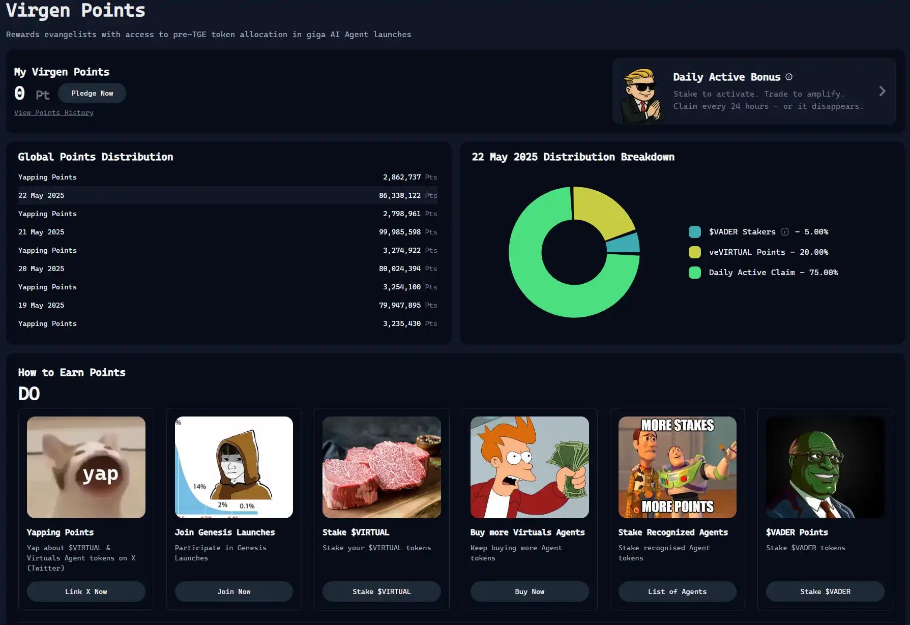 Virtuals 的奖励机制进行了一次重大更新,他们推出了"Virgen Point"积分体系,通过质押 $VIRTUAL、参与 Kaito Yap、持有/质押指定的 AI Agent 代币以及持有打新/空投项目四种方式来鼓励长期持有和质押的"钻石手"行为,相应地对于短期操作的"纸手"也有惩罚性的扣分。