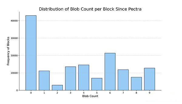 然而,由于使用率仍未达到目标,blob 手续费目前仍处于极低水平。自 Pectra 上线以来的 blob 分布数据显示,超过 40,000 个区块未包含任何 blob,而已有大约 52,000 个区块包含了 6 个或更多 blob,这意味着还有更多增长空间。