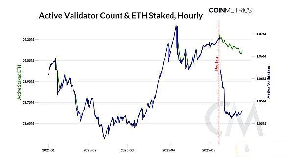 答:Pectra升级后,活跃验证者总数净减少了约16,344个,而每个验证者的平均质押量从约32 ETH上升至约32.4 ETH。