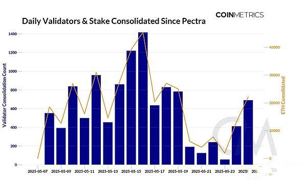 上图展示了已成功完成合并(进入活跃验证者集合)的验证者数量,以及合并的 ETH 总量。自 5 月 7 日 Pectra 硬分叉上线以来,截至 5 月 25 日,已有 11,150 个验证者完成合并,总计合并了 359,146 ETH。