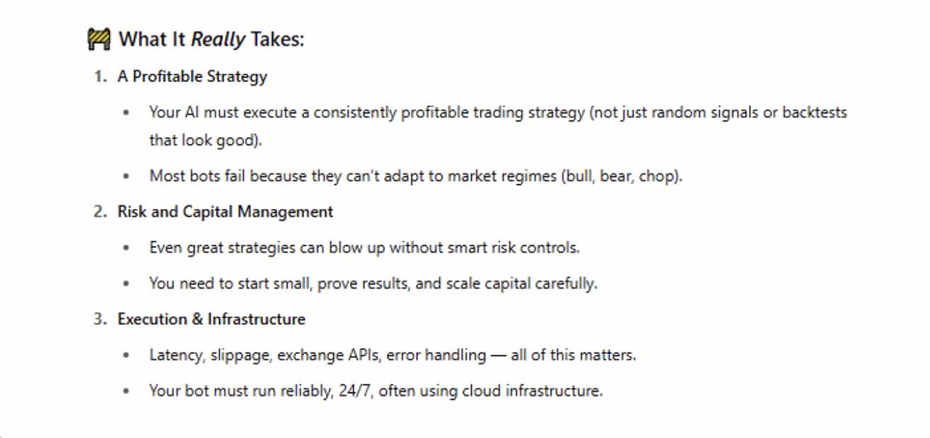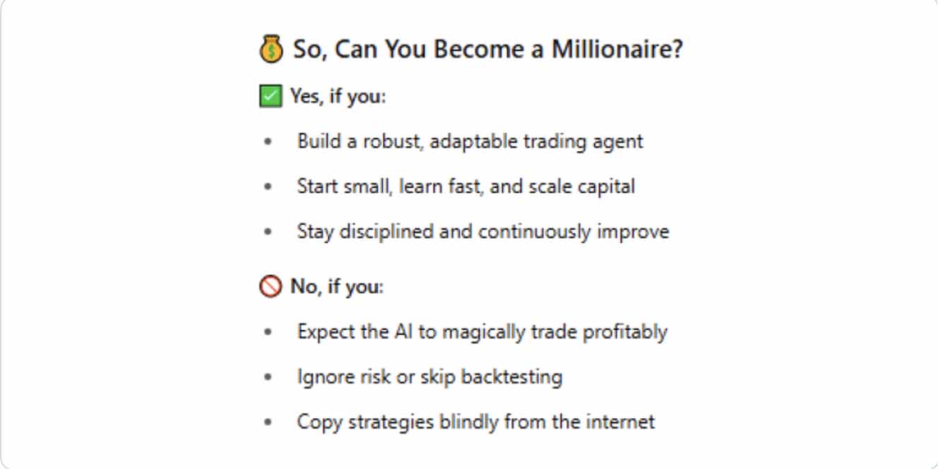 即使被问及"如果我使用ChatGPT构建一个用于加密货币交易的AI代理,我能成为百万富翁吗?",ChatGPT也给出了现实的看法——承认虽然有可能,但成功取决于拥有盈利策略、严格的风险管理以及有效扩展的能力。