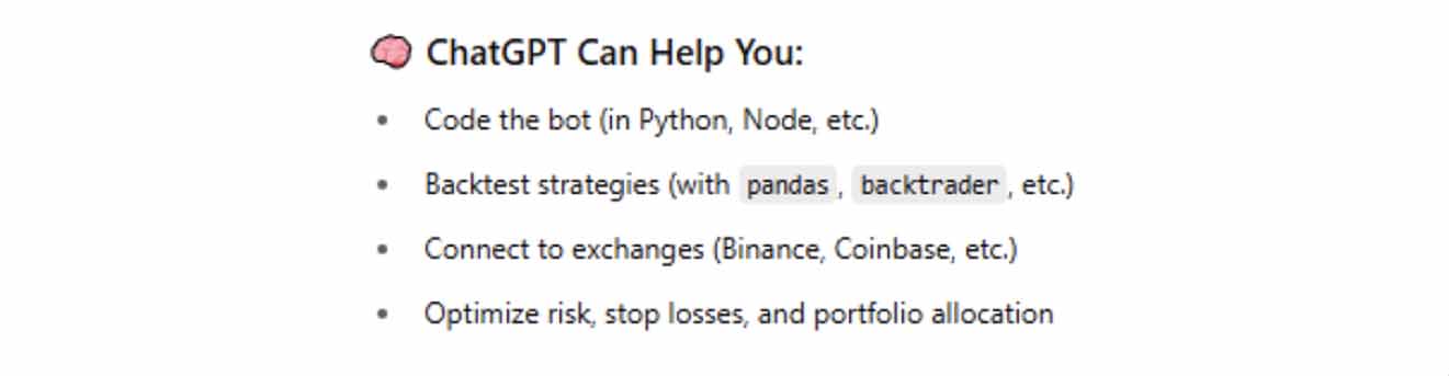 这些工具巧妙地将自然语言处理技术与实时交易逻辑结合在一起,在加密货币这个波动性极高的市场中实现自动化决策。无论是重新平衡投资组合,还是对市场情绪做出反应,ChatGPT都能扮演交易助手、风险管理者和市场分析师等多重角色。