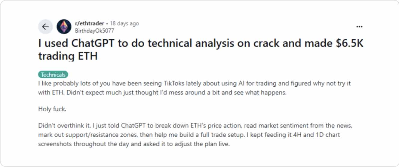 一些交易者已经开始使用ChatGPT来协助自动化他们的加密货币交易流程,特别是在策略生成和情绪分析方面。例如,一位Reddit用户分享了他使用基于ChatGPT的AI代理对以太坊(ETH)进行技术分析的经历,他输入了4小时和日线图表截图。通过解读市场情绪、支撑和阻力区域以及其他指标,他成功赚取了6500美元的利润。