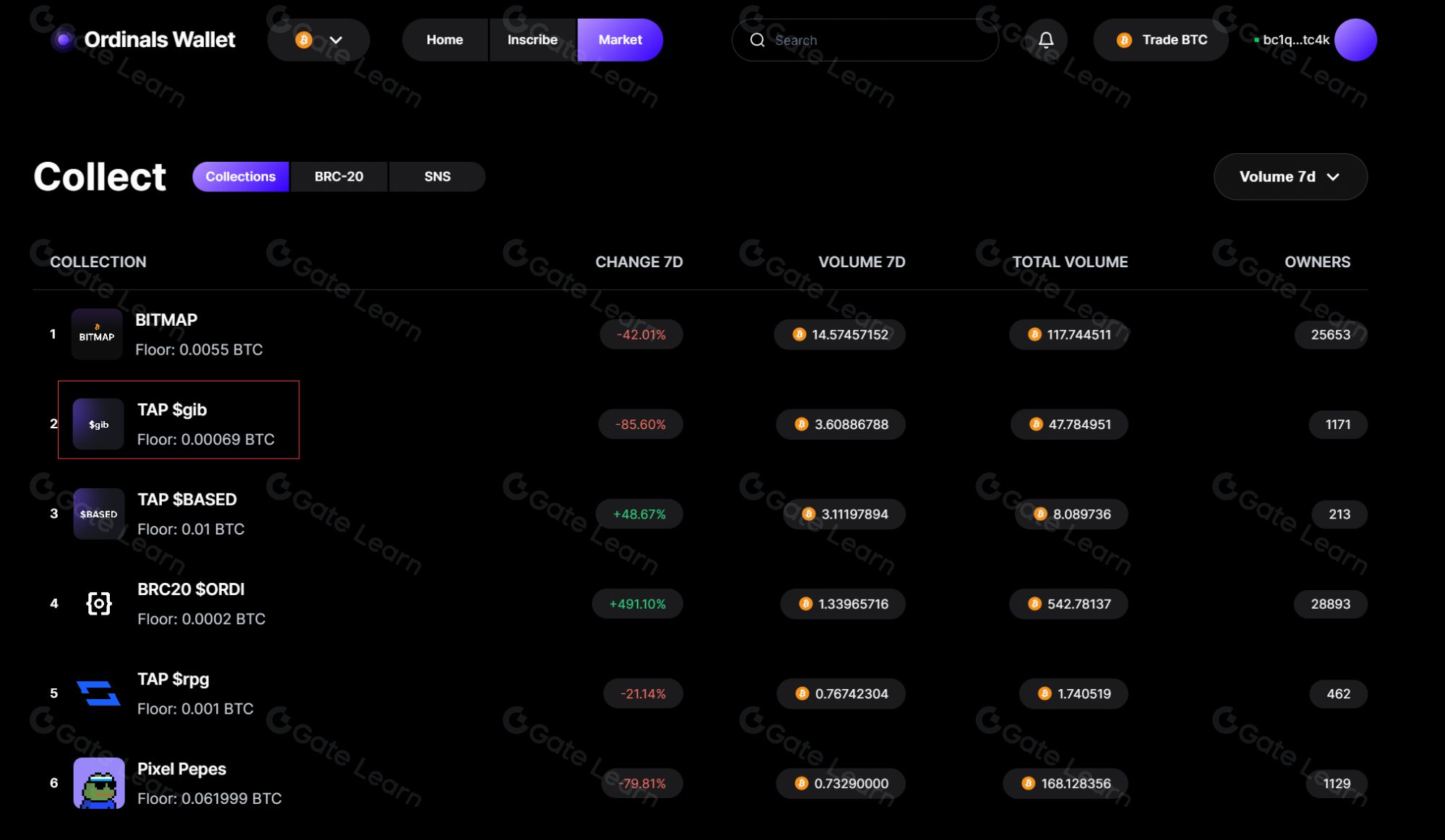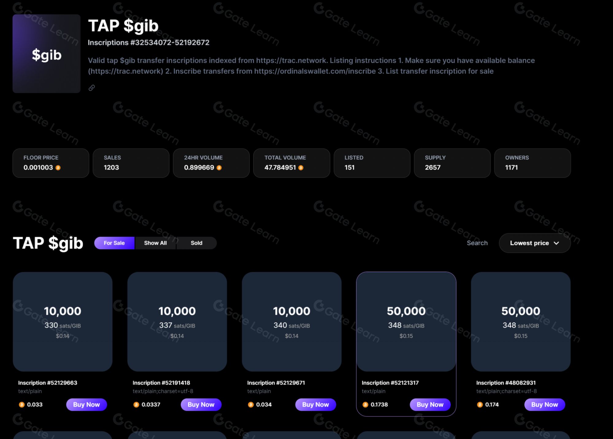 用户可以在Ordinals Wallet的【Market】页面看到名称前面带有"TAP"的即为Tap Protocol资产,以下图中的$gib为例,需要点击Logo进入详情页面。