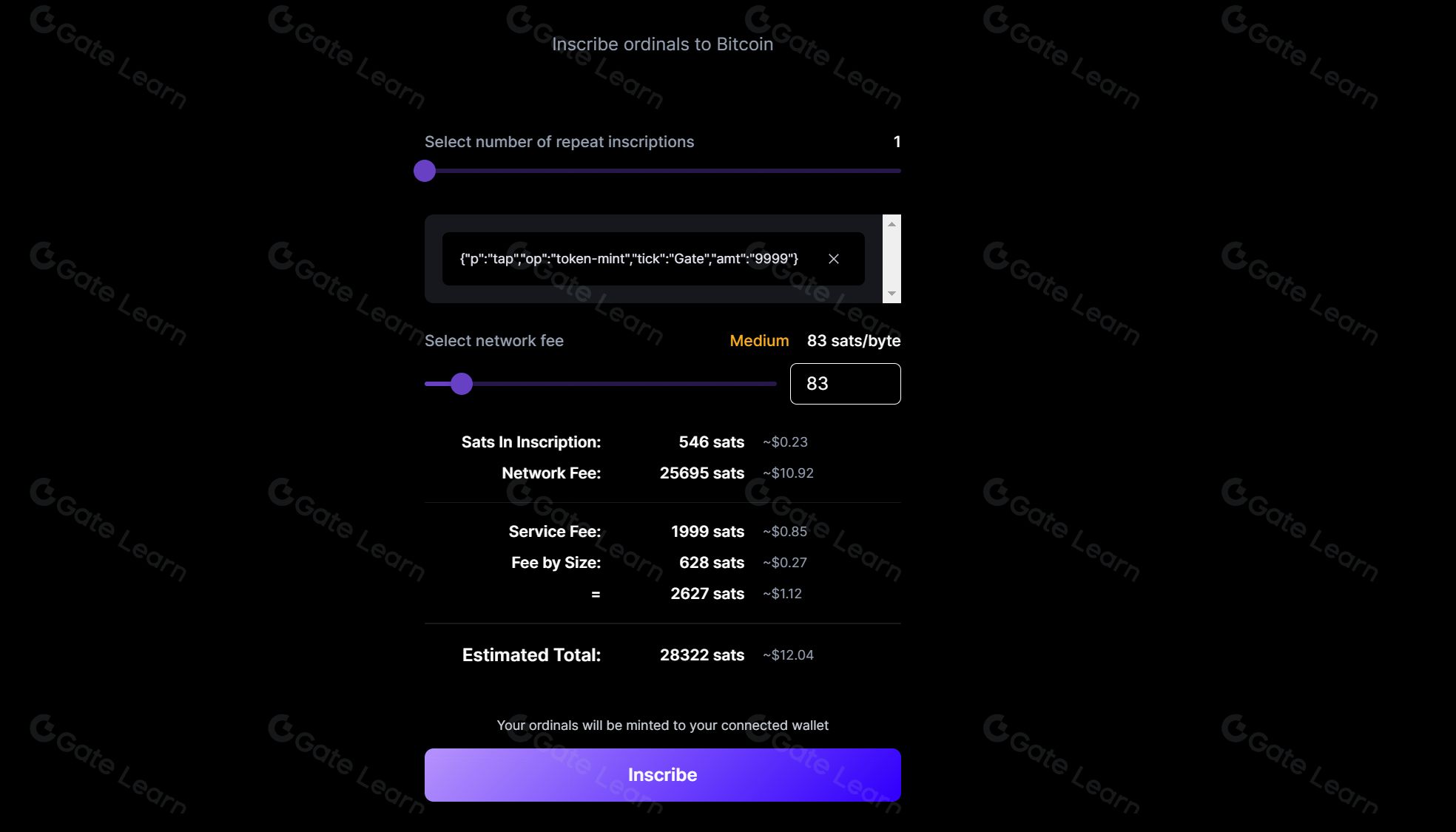 之后会进入费用估算界面,用户可以选择多次重复铸造,网站会预估相应的费用,最后点击【Inscribe】直接付费即可进行铭刻。