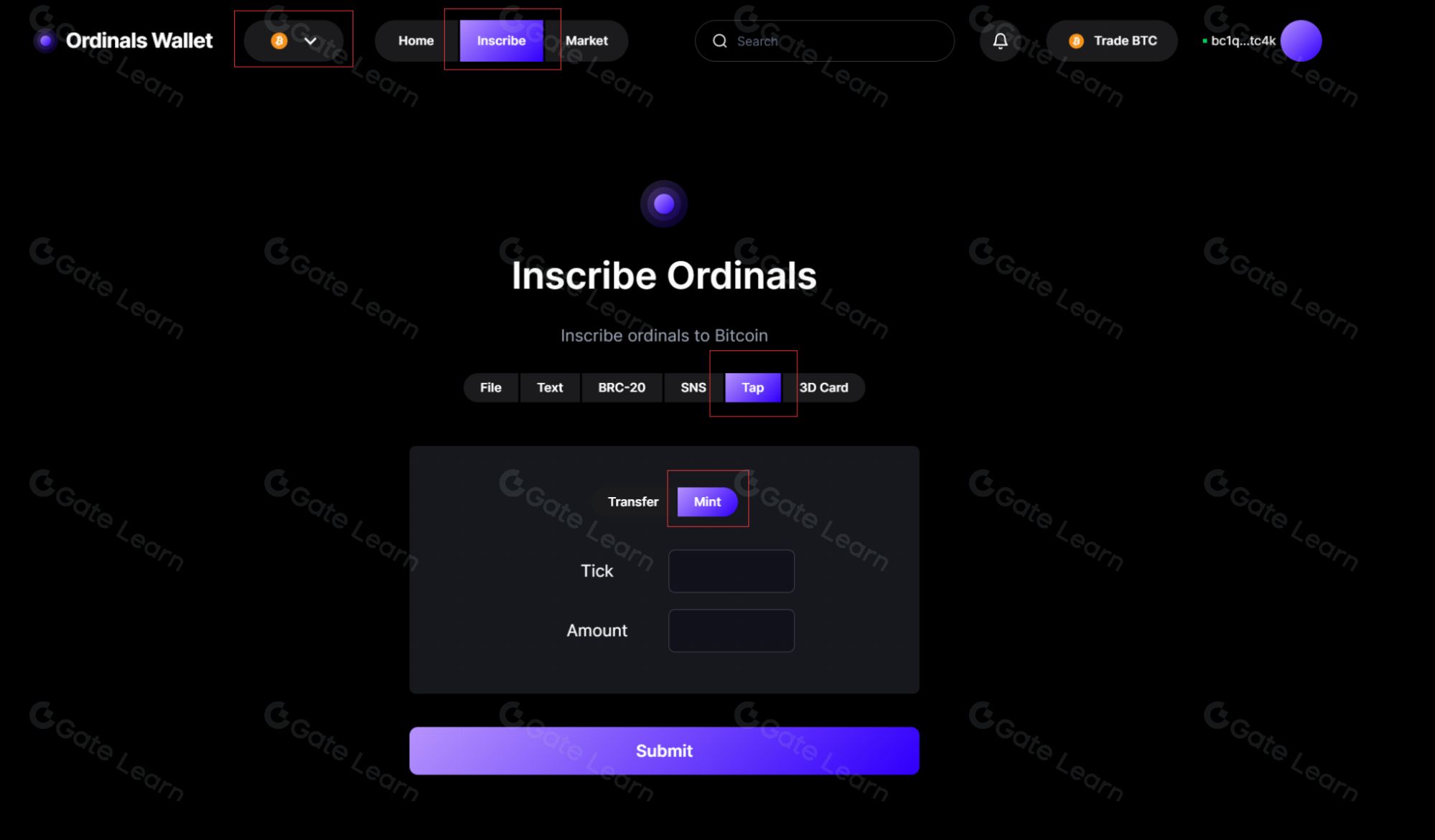 发行Tap资产可以使用OrdinalsWallet进行操作,在进入页面后,点击右上角进行钱包的了解,了解后选择BTC网络进入【Inscribe】,之后选择【Mint】即为铸造页面,用户只需要在【Tick】输入铸造的资产名称,在【Amount】填入铸造数量,点击【Submit】即可铸造。