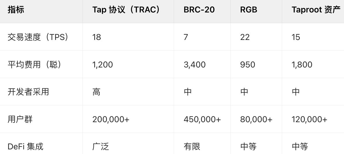 下表展示了Tap协议(TRAC)与竞争标准相比的关键性能指标: