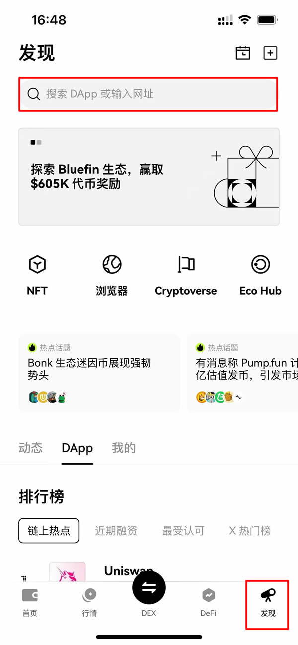 首先,打开你的OKX Web3钱包(官方注册 官方下载),在浏览器里的【发现】页面搜索PandaTool,很快就能找到PandaTool的DAPP了。