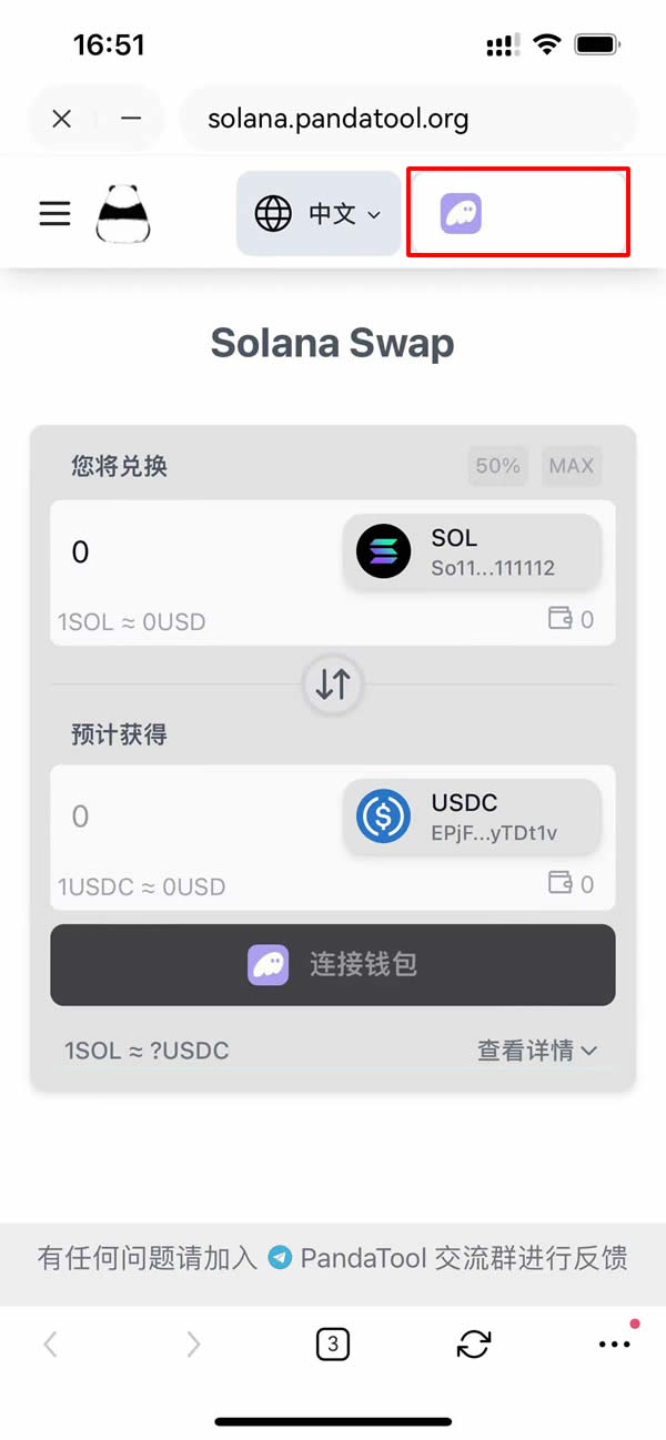 进入页面后,第一步就是连接钱包。点击右上角的连接钱包按钮,然后选择phantom。