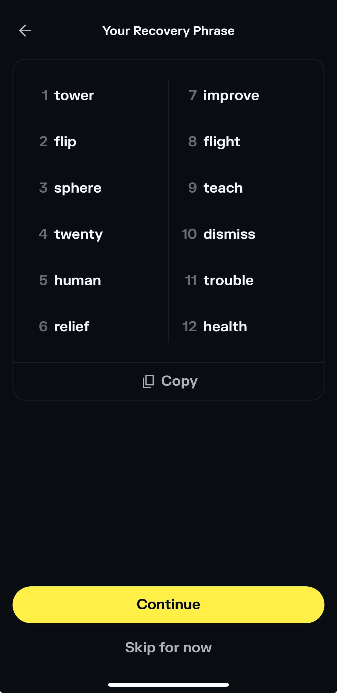 3. 记录您的恢复词:这是一组独特的单词,作为您的最终备份。请将此短语安全地离线存储。