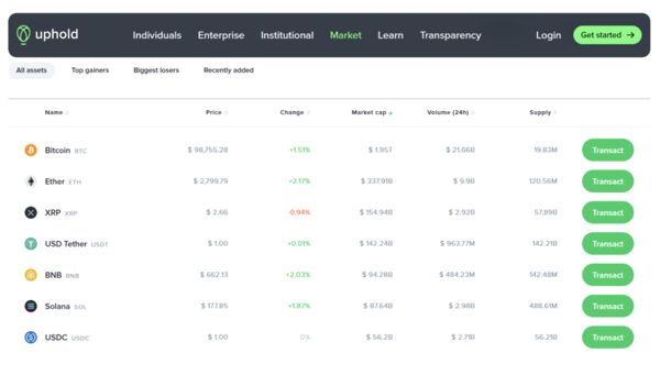 如果你想用覆盖范围比Kraken更广的交易所和钱包,可以选择Uphold。平台适用于美国、英国和欧盟。它支持300多种加密货币,如果你不在美国,是购买和存储加密资产的理想场所。