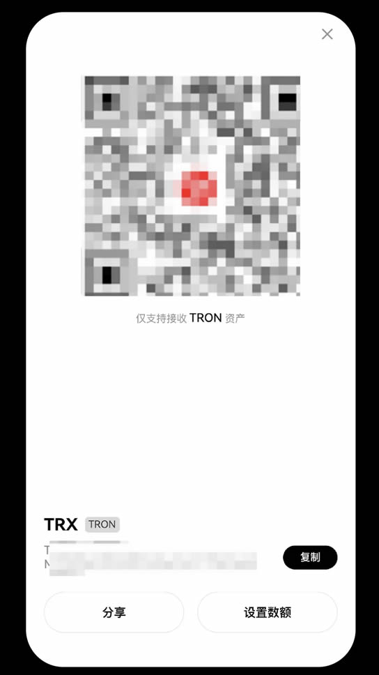 - 在发送资产确认页点【补充TRX】,复制收款地址或扫描二维码发给对方;也可以点【设置数额】指定收款金额。