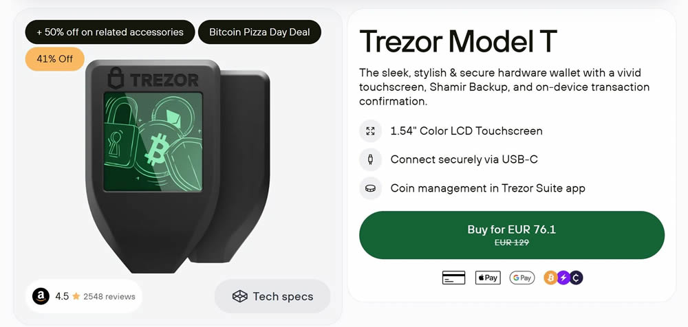Trezor Model T售价约 179 美元,是一款以开源固件和强大安全性著称的高端钱包。它支持超过 8,000 种加密货币,包括主流币种和 ERC-20 代币,并与 Trezor Suite 集成,方便管理。