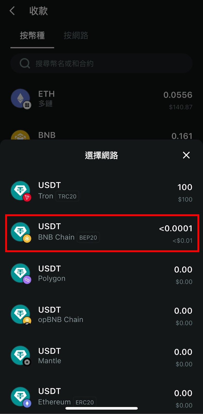 选择对应的网络类型非常重要,需要与您转出资产的来源钱包或交易所网络相匹配。例如:如果您准备从BNB Chain(BEP20)转账,这里也应该选择"USDT – BNB Chain"。