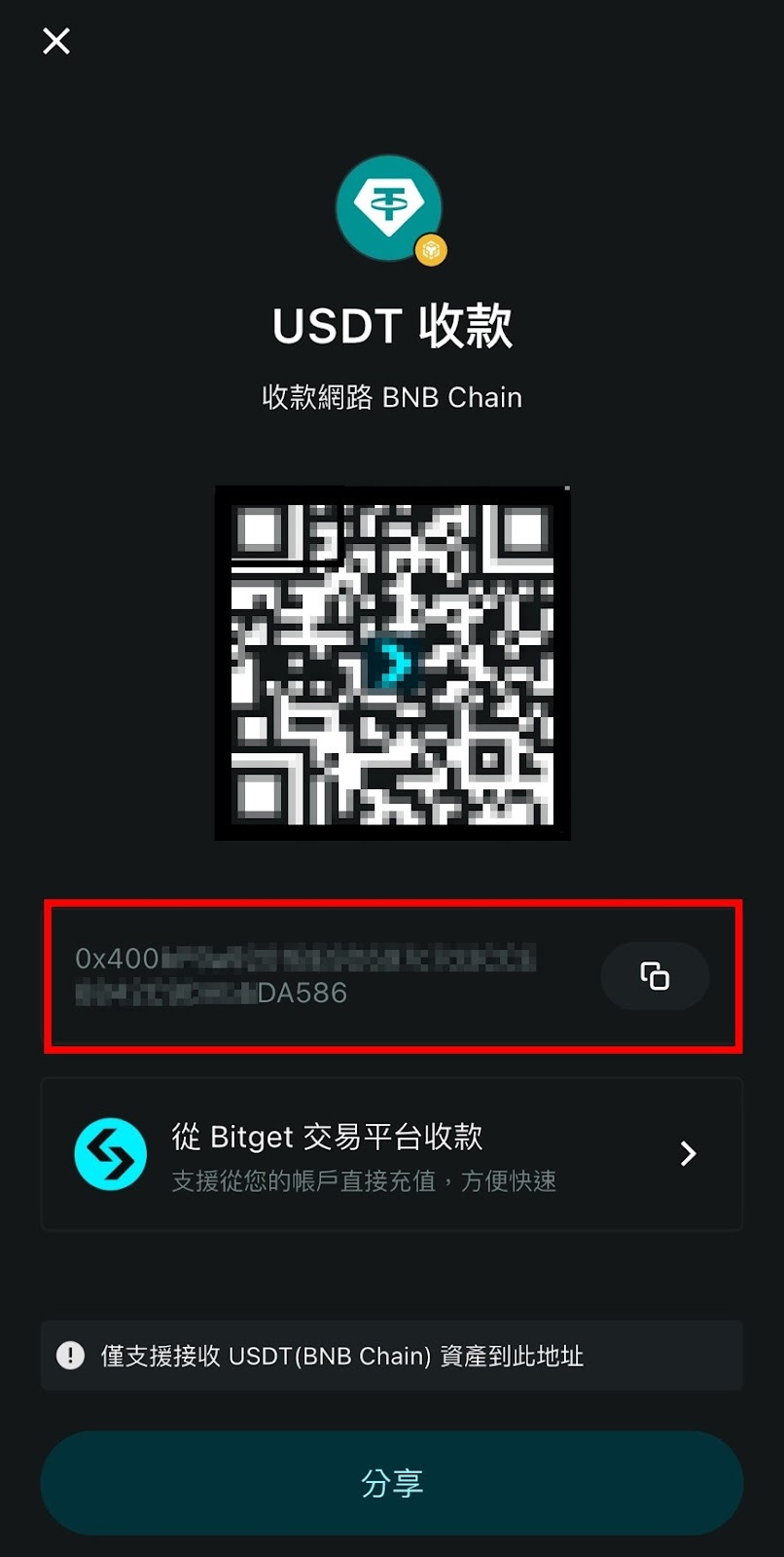 - Bitget Wallet只支持收取对应网络的资产,例如BEP20地址只能收取BEP20的USDT。