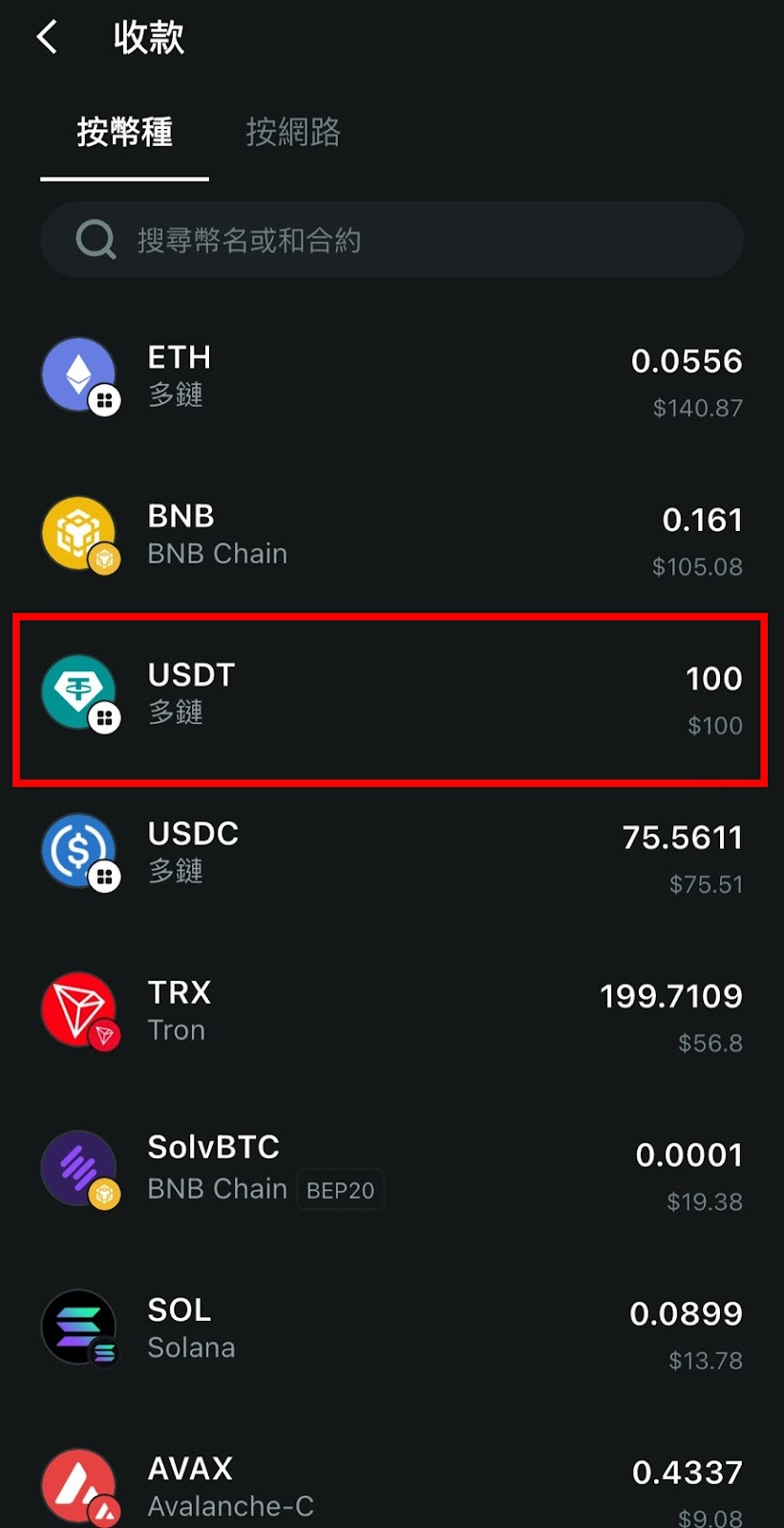进入收款界面后,您可以根据需要选择要接收的资产种类,这里以USDT为例进行说明。