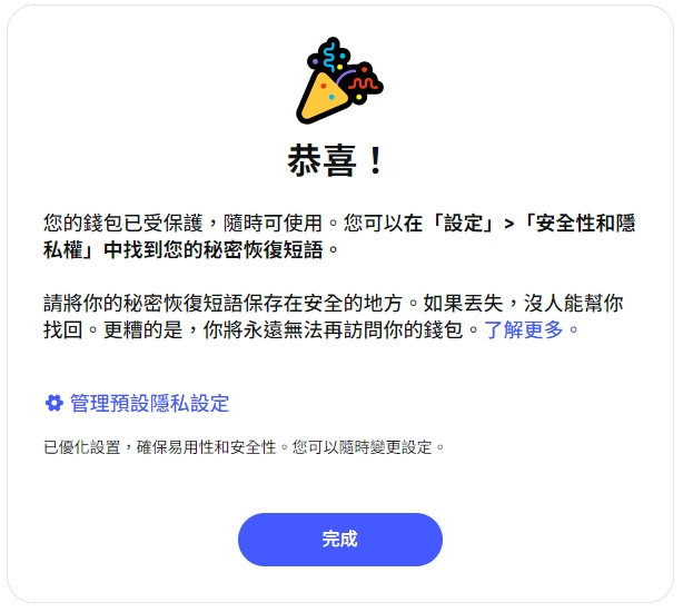 - Step 4:验证助记词顺序→ 完成创建!