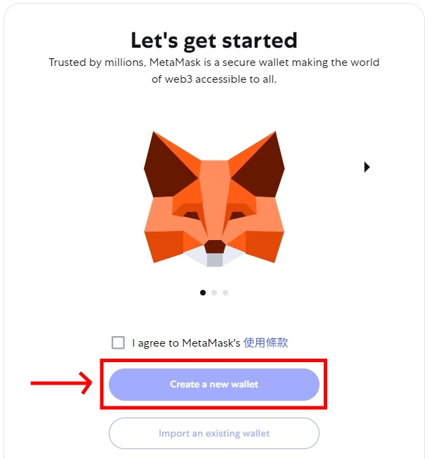 你会看到经典的狐狸脸动画,勾选使用条款后点击"Create a new wallet"。