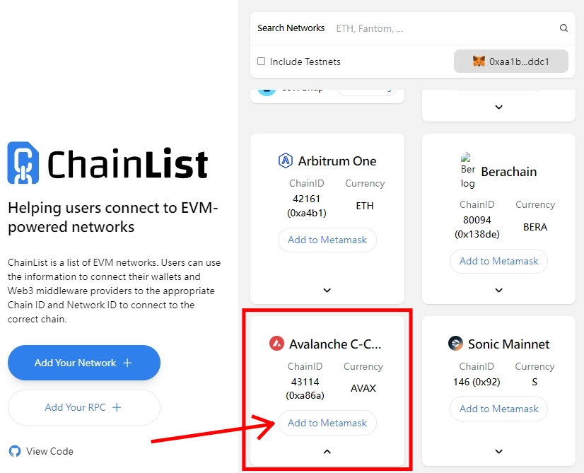 AVAX 链新增教学(以Chainlist 操作为例)
