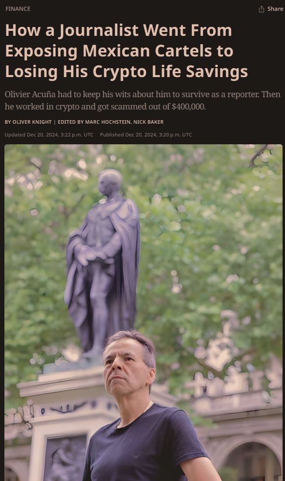 被骗者是奥利维尔·阿库尼亚(Olivier Acuña),一位曾在墨西哥深度调查毒 品集团和政府 腐败的资深记者。他不仅在新闻界摸爬滚打数十年,还转型进入加密货币行业,成为一名经验丰富的从业者。他曾在区块链公司 IoTeX 担任公关总监,管理公司的对外宣传工作,并积极推广区块链技术的应用。