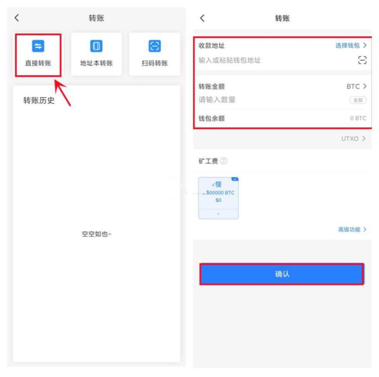 2. 在转账页面选择"直接转账",输入你要转账的地址,确认转账数量,点击"确认"即可完成操作(注意网络选择Bitcoin)